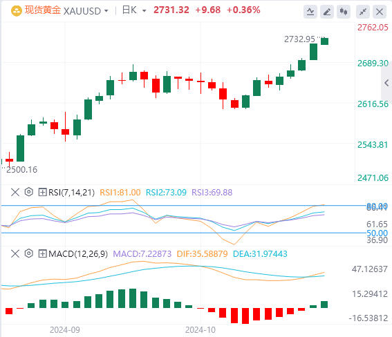 受地缘紧张局势和央行政策预期推动,预计金价将维持在2715美元上方强势,在市场情绪积极的情况下,阻力位目标为2736美元及以上。