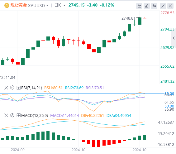 周二黄金价格维持在创纪录水平,美国时段金价最高交投于2745.01美元。考虑到中东地区的紧张局势和美国大选监控,在市场情绪低迷的情况下,金价维持看涨倾向。