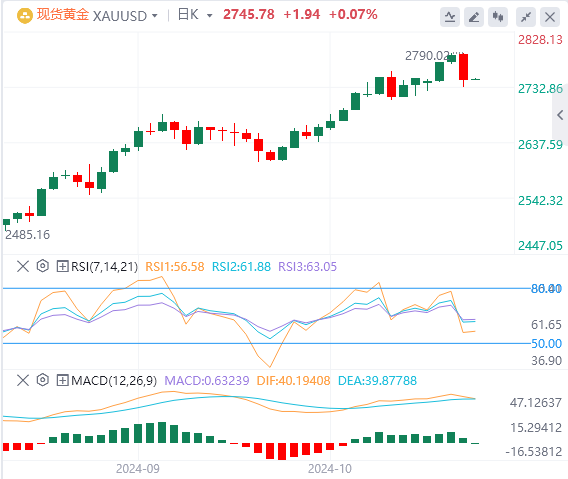 从技术面上来看,黄金虽然从历史高位回落,但前景依旧看涨,只要金价维持在2700关口之上,一旦其重新突破2750,黄金有望进一步上涨,进而突破历史高位2790。此后就朝着2800关口发起进攻。但若空头继续施压导致金价跌至10月23日的低点2708,则大概率将触及2700关口。下方空头目标为2685,若跌势扩大,可能会跌向50日简单移动平均线(SMA)2603。