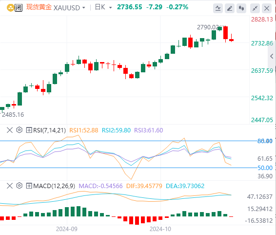 金价周五下跌,受美元走强和公债收益率走高的打压,但全球最大经济体就业增长数据疲软,促使分析师加大了对美联储降息的押注,从而限制了部分跌幅。现货金XAU=下跌0.2%,至每盎司2736.28美元。由于一些交易商在金价创下2790.15美元的历史新高后获利了结,周四金价下跌了1.5%。美国期金GCcv1基本持稳于2749.2美元。