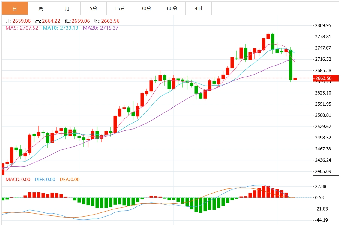 技术面来看,日线级别,金价跌破了布林线中轨和7月份以来上涨通道,后市可能会进一步下探布林线下轨2621.56附近支撑和10月10日低点2602.54附近支撑。