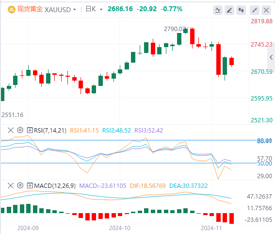 黄金在关键枢轴点2684.08美元附近徘徊。这一水平非常重要——低于这一水平可能会保持看跌趋势,即时支撑位为2668.38美元,进一步下跌至2654.34美元。