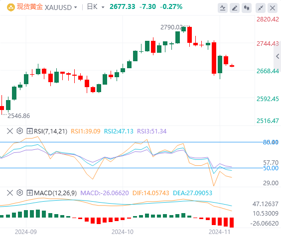 随着特朗普胜选前景越来越明朗,上周三黄金暴跌。大部分抛售可归咎于受此消息影响飙升的美元,而这反过来又可以归咎于美债收益率的大幅上涨,因为投资者担心特朗普承诺的关税和减税将导致通胀复苏。自那以后,美元和收益率已经回到了更合理的水平,这帮助黄金找到了底部,并在上周四出现反弹,但上周五反弹势头减弱,再次屈服于抛压。黄金的支撑位继续保持在2635美元至2675美元。这个区域在9月最后一周和10月第一周起到阻力位作用。