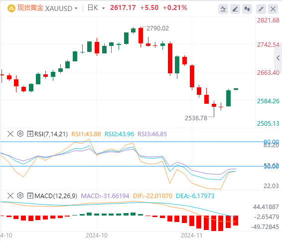 美元在上周上涨1.6%后涨势暂停导致金价反弹,得益于美联储将缩减降息幅度的预期,美元指数在10月份表现强劲后仍保持高位。美债收益率上升继续限制黄金的上行空间,交易员们将密切关注美联储官员本周的言论,以进一步明确货币政策。