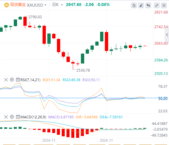 周三,现货黄金持续震荡走势,最终收涨0.24%,截至目前,黄金报价2647.68。