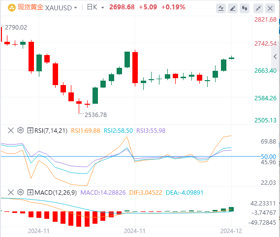 周二,金价上涨,多头正在努力地将金价抬升至2700美元之上。这是自11月25日从2721美元高点下跌以来的首次回温。推动金价上涨的利好因素之一是市场预期美联储将在12月会议上降息。隔夜美国公布的经济数据显示,根据全美独立企业联合会的一项调查,中小企业对经济的乐观情绪有所增强。不过,交易员们的注意力仍集中在今晚公布的11月CPI数据和周四公布的11月PPI数据上。投资者似乎确信美联储将在12月18日的会议上降息,利率市场认为在12月会议上美联储降息的概率为86%。此外,受市场对中国央行对于黄金需求恢复的预期以及中东地缘冲突升温的影响,金价从周一起开始飙升。