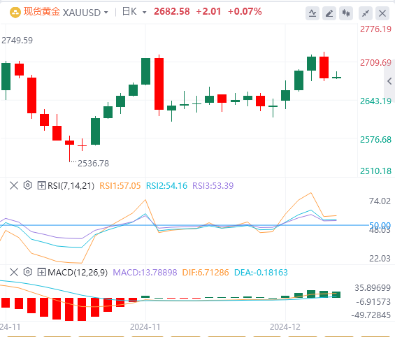 12月13日,周五欧市盘中,黄金在2688美元附近坚挺,由于避险需求持续,金价达到2692美元的盘中高点。地缘政治风险,包括东欧和中东持续的紧张局势,以及美国当选总统唐纳德·特朗普关税政策的不确定性,都增强了黄金的吸引力。此外,对美联储下周降息25个基点的预期继续支撑价格。