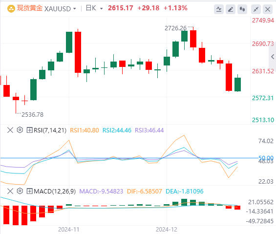 黄金价格飙升至日内高点2618美元,无视美元走强的典型不利因素。在地缘政治风险和经济不确定性加剧的情况下,投资者对避险资产的需求推动了这一反弹。