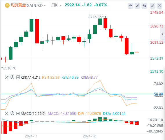金价上涨趋势完好无损,尽管它在100天简单移动平均线(SMA)2605美元和2600美元心理数字处面临阻力。短期内,势头有利于卖家,如中性线下方的相对强弱指数(RSI)所示。要恢复看跌,空头需要清除2550美元的数字,然后是11月14日的摆动低点2536美元。如果超过,下一站将是2500美元的水平。要恢复看涨,黄金必须清除2600美元,然后是2650美元,50天SMA位于2670美元。一旦清零,下一站将是2700美元。