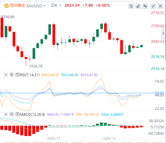 双顶形态正在限制上升势头,表明该关键水平存在潜在阻力。如果金价突破直接阻力位2651.62美元,短期内可能瞄准2679.38美元。