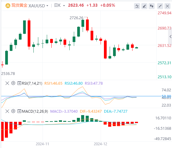 受美债收益率在假日交易清淡期间上升的压力,金价在周五下跌。收益率上升和美元走强令黄金承压,因为这降低了投资者对于无息资产的兴趣。此外,截止至12月21日当周,初请失业金人数低于预期和前值,虽然续请失业金人数却上涨至2021年11月以来的最高点。但这些数据表明劳动力市场具有韧性,支持了人们对2025年美联储采取鹰派立场的预期。