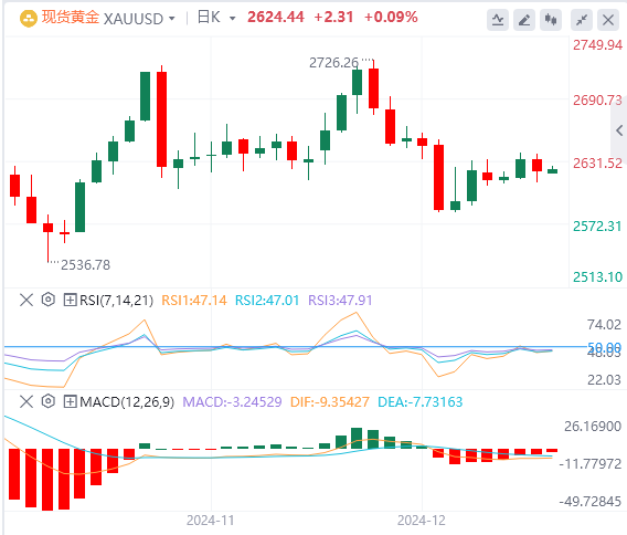 在下行方面,黄金可能在九日和十四日EMAs的2624.00和2628.00附近找到即时支撑。若跌破这些水平,可能增加卖压,推动金价向月低点2583.39。