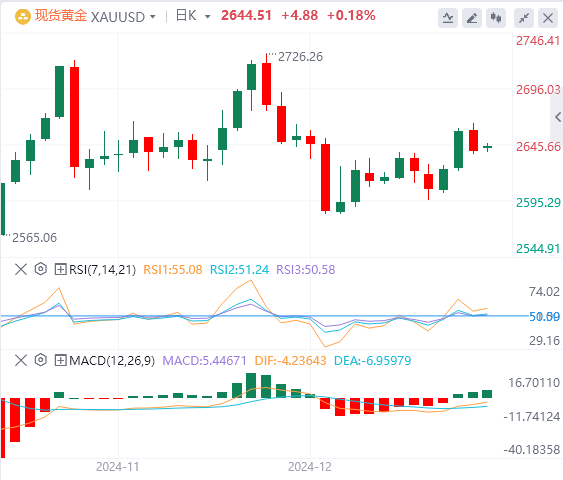 从技术面来看,黄金在2024年最后一个季度一直在挣扎,金价围绕2650美元上下波动。而50日指数移动平均线(EMA)的趋势变化凸显出黄金的盘整格局。多头多次在2720美元附近止步,而黄金承受的强劲抛压却在2600美元附近总是得到买盘的支撑,形成短期技术支撑位。