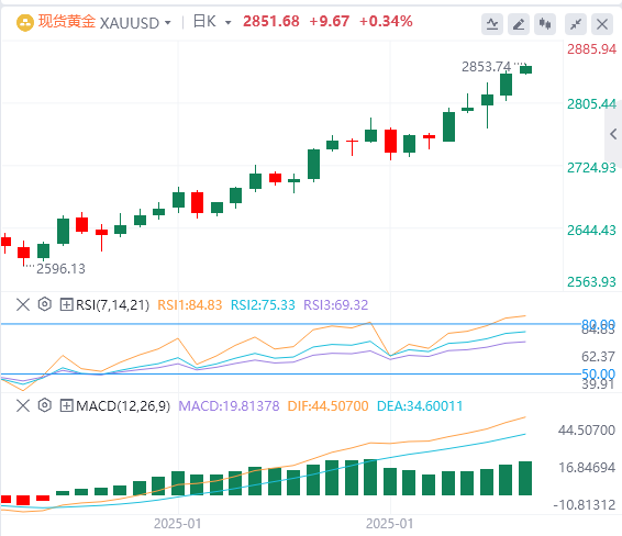 现货黄金日线级别的14日RSI已经正式踏入超买区,近期的价格走势与2024年时的突破行情十分相似。在我看来,61.8%斐波那契扩展位2850美元成为关键的分水岭,若能实现有效突破将完全打开至78.6%扩展位2940美元的上行空间,中长期目标则为重要心理关口以及161.8%扩展位3000美元。