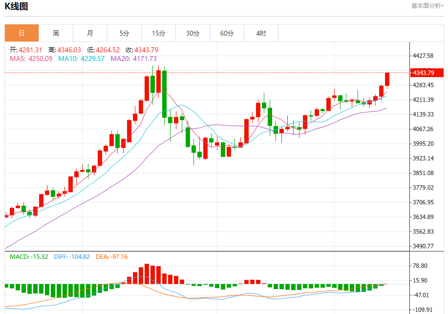 从日线图RSI指标来看,当前处于58.99的水平,尚未进入超买区域,表明短期内仍有上行空间。布林带指标显示,价格目前在中轨上方运行,上轨位于3468.23,下轨位于2968.48,表明当前处于强势通道中。