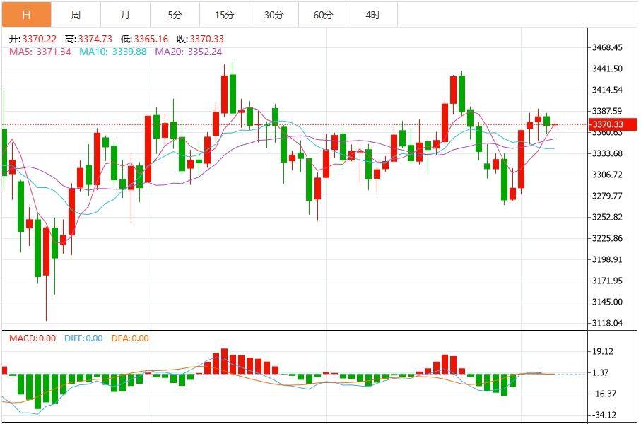 从日线图来看,金价目前运行于布林带中轨与上轨之间,略高于中轨水平3344.86美元,整体仍处于高位震荡区间。布林带带宽未显著收窄,表明市场波动率仍处于相对中性区间。近期金价数次冲击上轨未果,前高3451.14美元与3438.80美元已构成显著阻力带。下方支撑则位于3276.39美元附近,即布林带下轨位置,该位与前低3120.64美元形成次级防守区域。