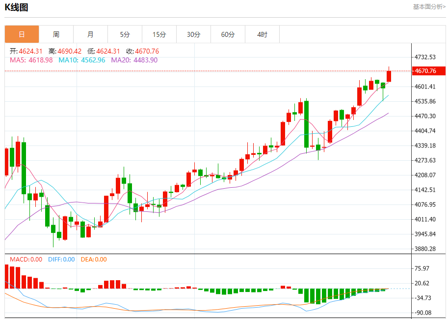 日线级别来看,黄金强势格局未改。自1月初突破4550美元/盎司关键阻力位后,金价持续运行于上升通道内,均线系统呈现完美多头排列,5日、10日、20日均线依次向上发散,价格始终站稳5日均线上方,回调时能快速获得买盘承接,印证当前多头主导的市场格局。从K线形态来看,近期金价以小阴小阳交替震荡为主,未出现大幅回调的破位K线,这种走势属于突破后的健康整理,既能消化前期获利盘,也能为后续上行积蓄动能。成交量方面,震荡阶段量能温和萎缩,符合“放量上涨、缩量调整”的良性走势特征,进一步验证了当前趋势的稳定性。