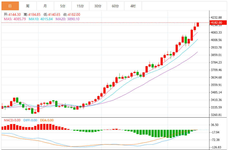 截至2025年10月16日19时25分,国际黄金期货(纽约金)价格为4260.2美元/盎司,较前一交易日上涨58.6美元,涨幅1.39%,最高达到4262.5美元/盎司,最低为4214.5美元/盎司。国际黄金现货(伦敦金现)价格为4244.91美元/盎司,上涨35.72美元,涨幅0.85%,最高4245.82美元/盎司,最低4203.28美元/盎司。 从技术分析来
