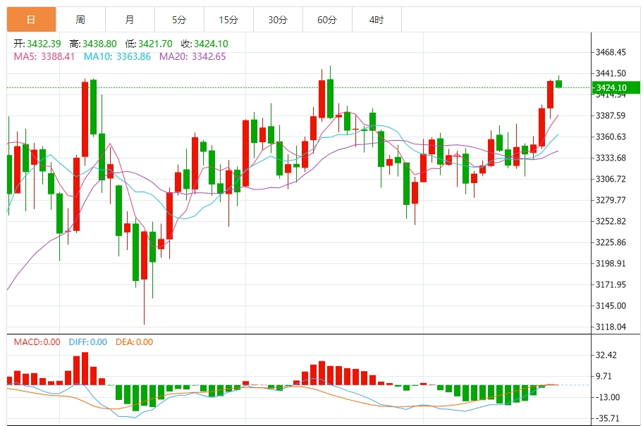 一、关键点位的技术分析框架 从日线级别看,黄金近期呈现三连阳的强势形态,价格突破3400美元关键阻力位后,形成多头排列格局。技术指标显示: 支撑位:第一支撑位于3405-3398美元区间,该区域是顶底转换位,同时对应5日均线支撑;第二支撑为3385-3383美元,由趋势线构成,也是昨日欧盘触底反弹的起点。