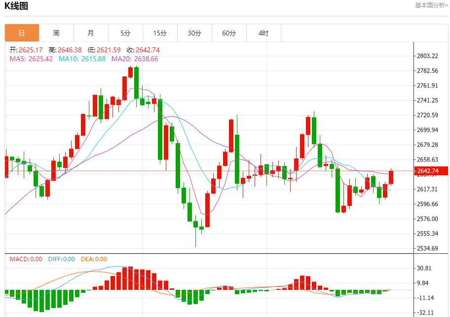 黄金走势主要点位解析 周四,4小时黄金波动轨指标关键点位2591、2601、2633、2643。黄金波动轨主要用在震荡行情,运用波动轨中轨(红色线)判断是趋势还是震荡行情,中轨接近水平,先看做震荡行情。在震荡行情当中,则主要考虑行情运行到波动轨轨道附近的博弈反转机会。关注2.5倍波动轨上轨2644附近的博弈反转机