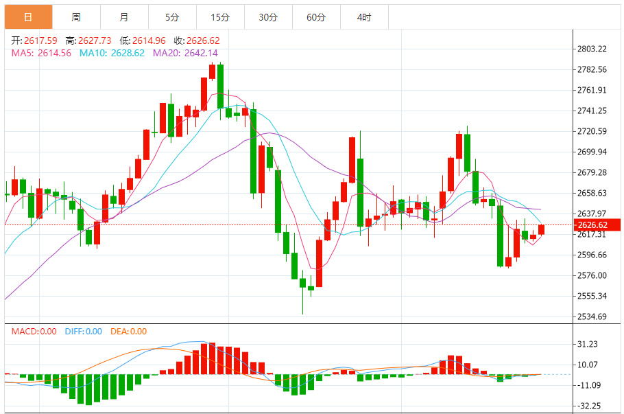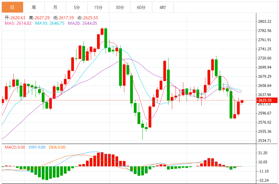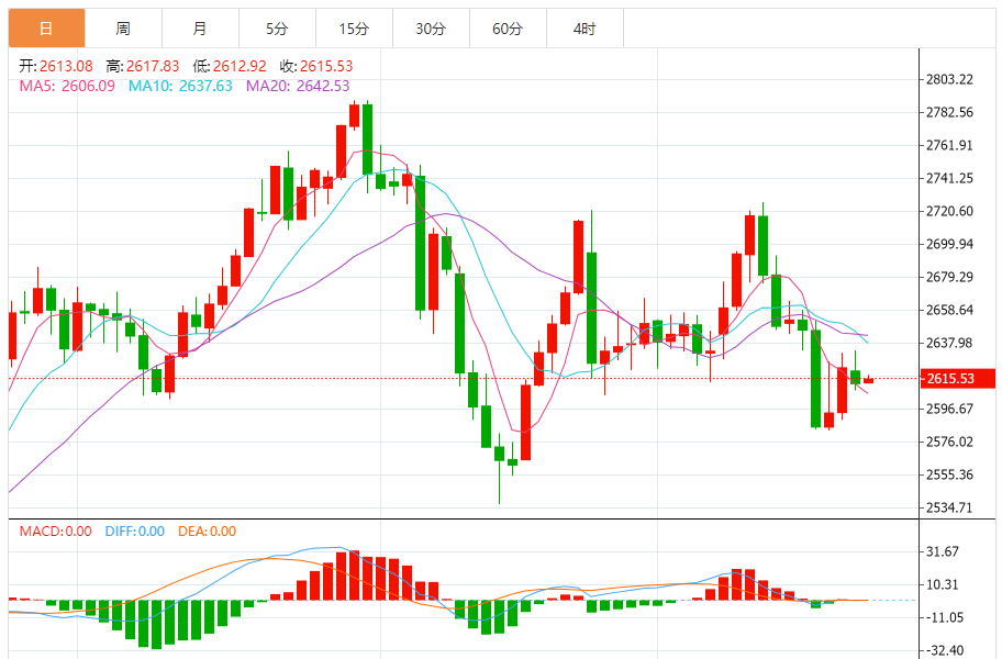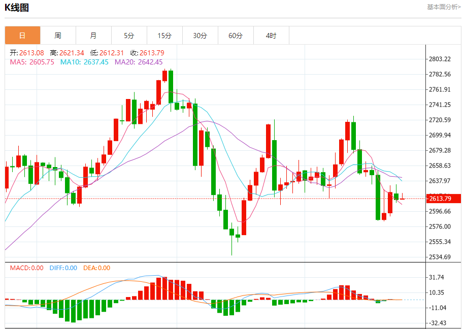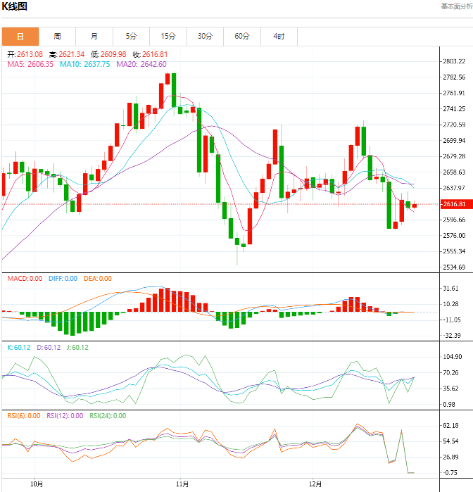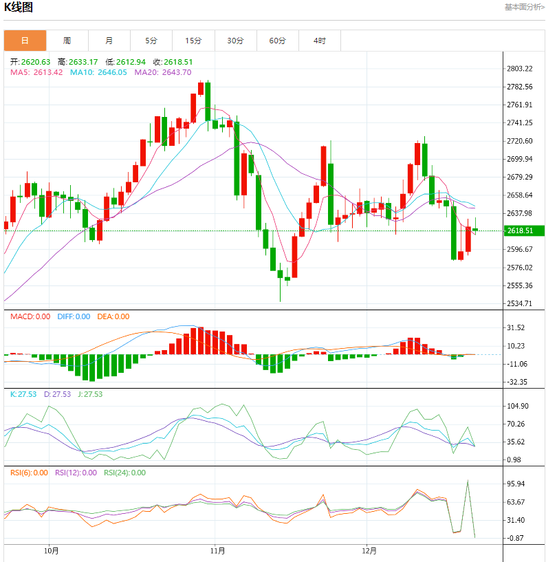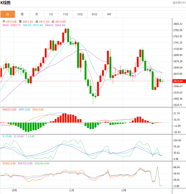 周三(12月25日)黄金市场因为圣诞节假期休市金价周二在假日清淡的交易中持稳,黄金价格收盘报2613.73美元/盎司。 今日黄金价格技术分析: 黄金昨天再度承压2632后展开回撤,从盘面的运行节奏来讲,承压2632下跌,和冲破2632拉高之后再下跌的意义都是一样的。而昨天晚间持续震荡下跌最终收弱,显示盘面依旧是