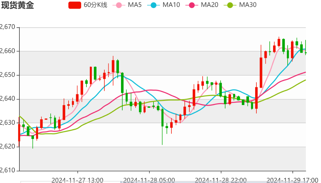 11月29日,周五欧市初盘,黄金攀升至2664美元的四天高点,在地缘政治不确定性和市场动荡的共同推动下继续上涨势头。随着对贸易战和持续经济挑战的担忧持续存在,投资者越来越多地转向黄金等避险资产。 美联储12月再次降息的预期以及美国国债收益率的显着下降进一步支撑了这一反弹。 美元徘徊在两周低点附近,因为市场
