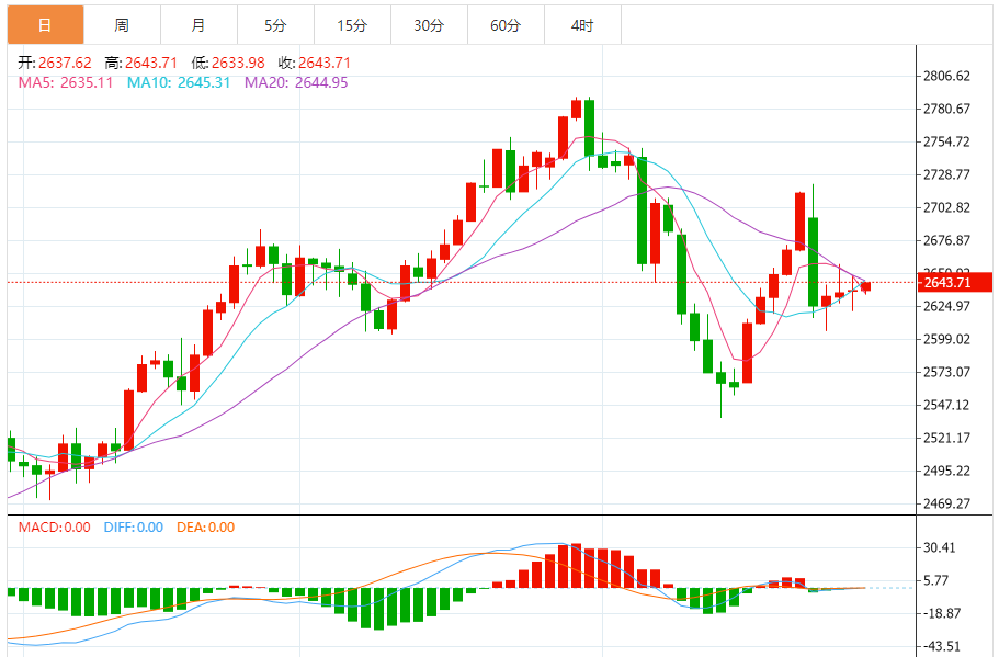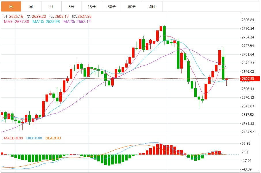 黄金走势主要点位解析 周四,1小时黄金波动轨指标关键点位2621、2626、2643、2747。黄金波动轨主要用在震荡行情,运用波动轨中轨(红色线)判断是趋势还是震荡行情,中轨稍稍朝下,先看做震荡偏空行情。在震荡偏空行情当中,则主要考虑行情运行到波动轨轨道附近的博弈反转机会。关注波动轨1.5倍波动轨下轨2626以