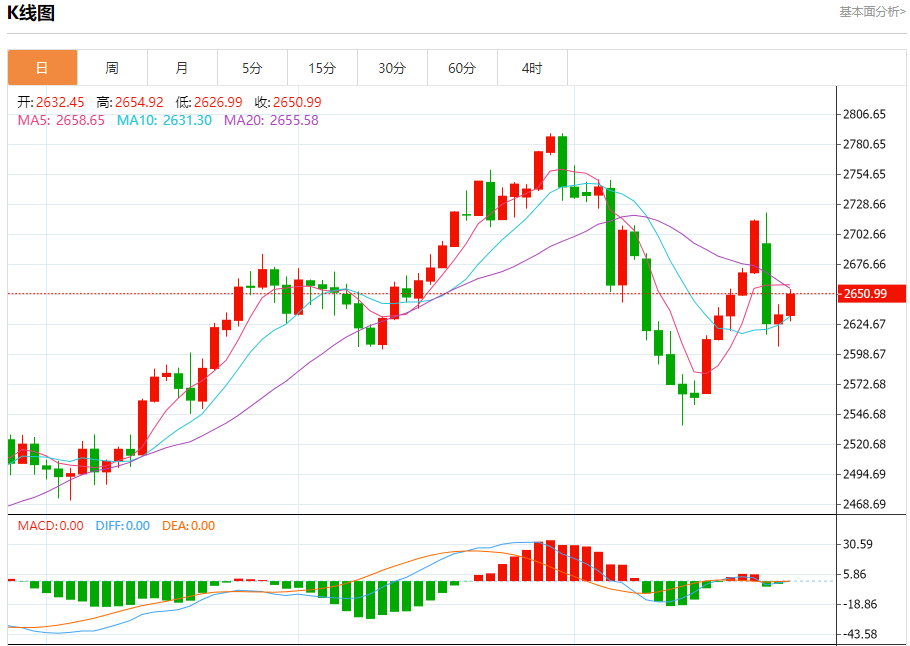 周三盘中,现货黄金报2650.92,涨幅0.68%。 今日分析:在2636.00之上,看涨,目标价位为2662.00,然后为2669.00。 技术点评:在2636.00之上,为多头信号,向上的目标位为2662.00。 支撑位:2636.002627.002619.00 阻力位:2688.002669.002662.00 (亚汇网编辑:冰凡)