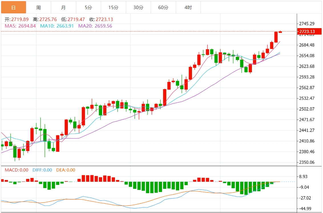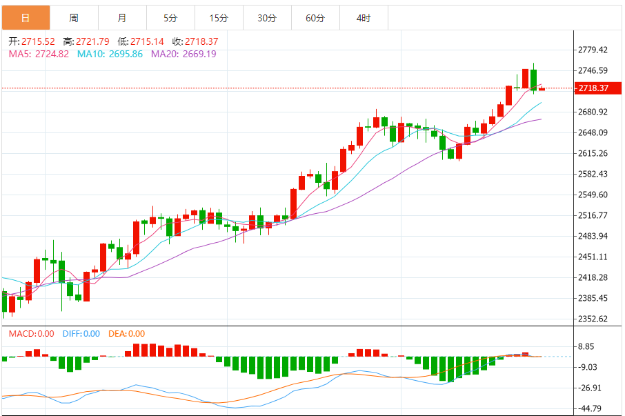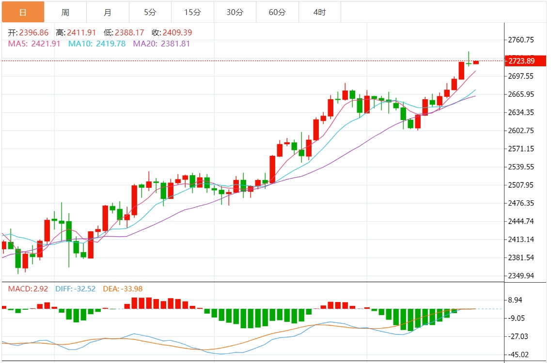 10月22日,周二亚市早盘,黄金交投于2723.71附近。 现货黄金周一日线不断创下新高,最高交投于2740.42美元,随后在华尔街开盘后回撤。由于迫在眉睫的美国大选加剧避险资产需求,美元与政府债券收益率一起蓄势待发。《华盛顿邮报》最新民调显示,共和党候选人唐纳德-特朗普和民主党候选人卡马拉-哈里斯在七个关键州的支