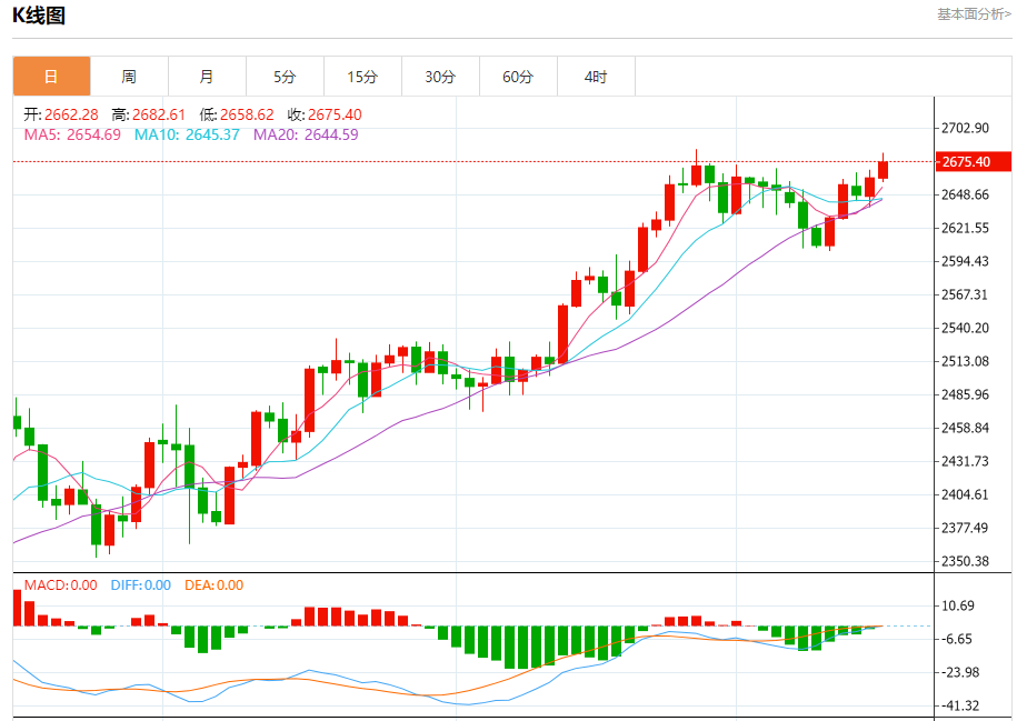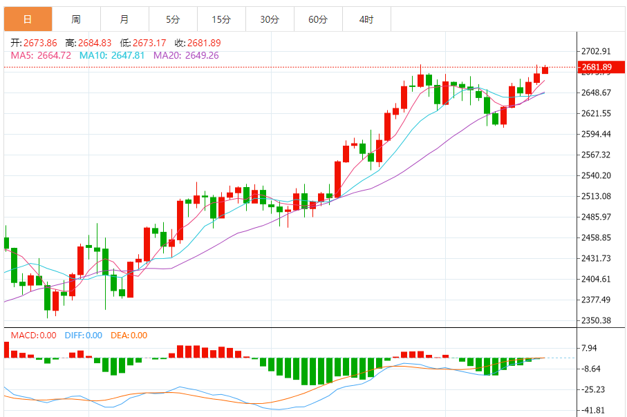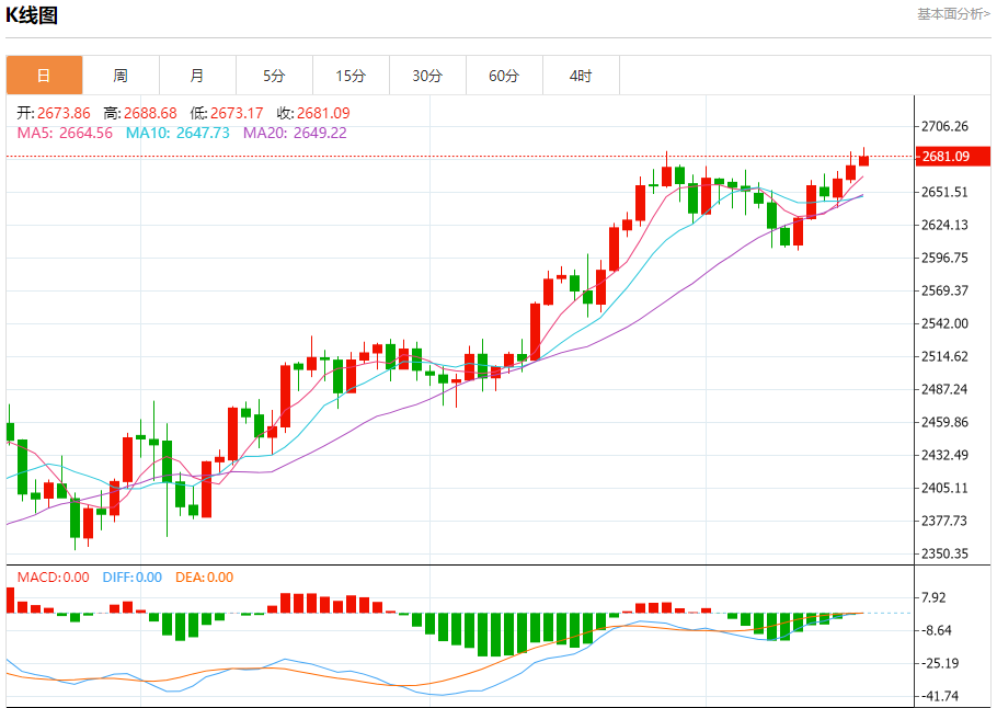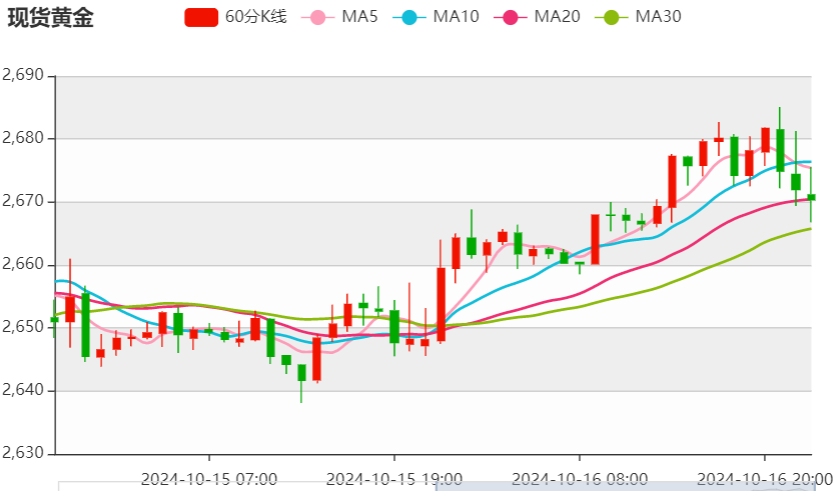 周四(10月17日),现货黄金在昨日大涨后维持坚挺走势,金价目前位于2682美元/盎司附近。尽管美元走强,但避险情绪继续推动黄金需求,周三金价一度逼近纪录高位。 黄金市场基本面分析 现货黄金周三收盘上涨10.99美元,涨幅0.41%,报2673.59美元/盎司。金价盘中一度飙升至2685.36美元/盎司,非常接近9月26