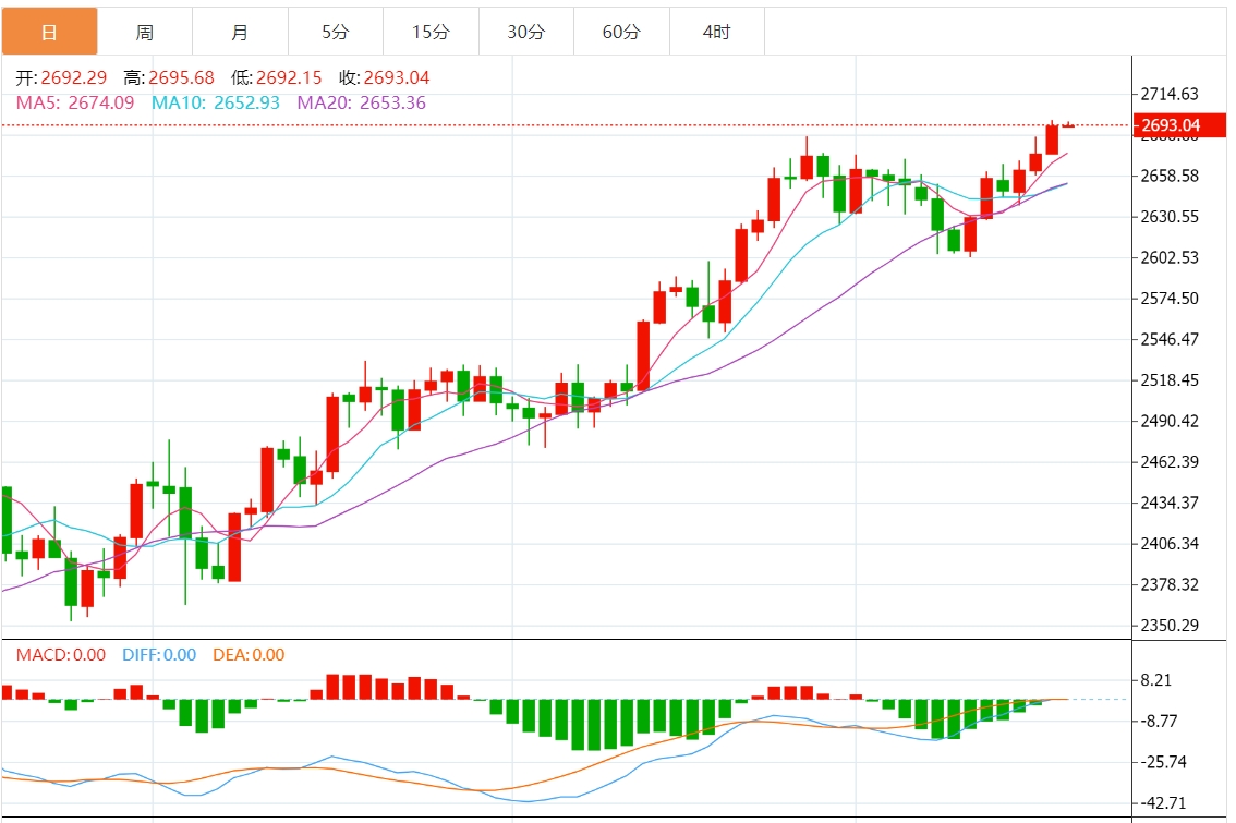 周五(10月18日)亚盘,现货黄金高位窄幅震荡,目前交投于2694.31美元/盎司附近。金价周四创下历史新高至2696.63美元/盎司,收报2692.75美元/盎司,由于围绕美国总统大选和中东战争的不确定性促使投资者寻求避险资产,同时宽松的货币政策环境促使金价保持高位。本交易日需要关注美国9月营建许可年化总数初值和美国9月新