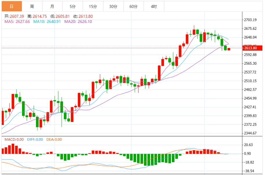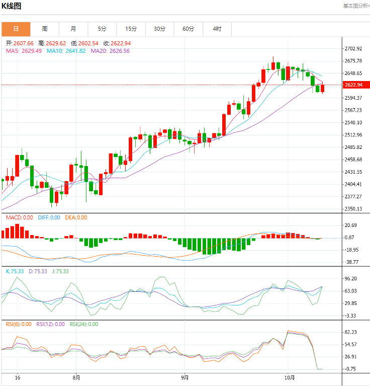 周四(10月10日),现货黄金在昨日大跌后维持日内温和反弹走势,目前金价交投在2613美元/盎司附近。 黄金市场基本面分析 周三,由于美联储会议纪要导致美元走强,黄金连续第六个交易日回落。现货黄金周三收盘重挫14.13美元,跌幅0.54%,报2607.71美元/盎司。金价盘中最低跌至2605.16美元/盎司。 黄