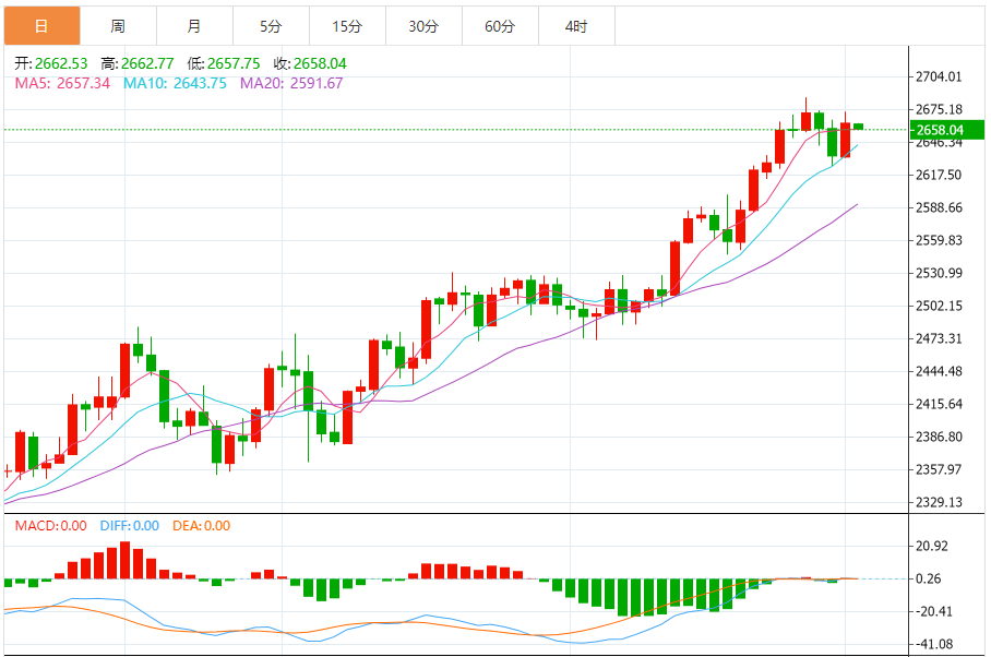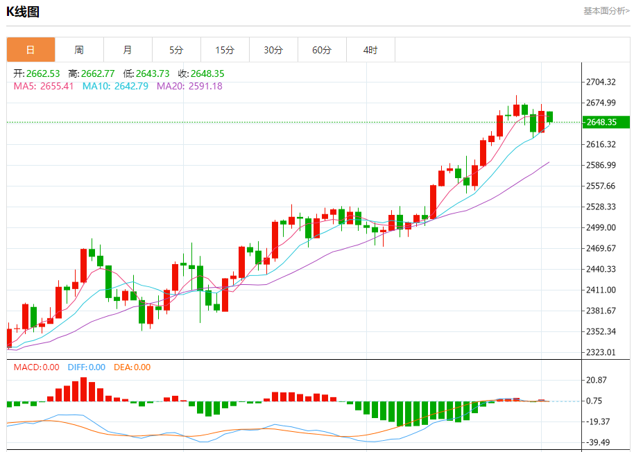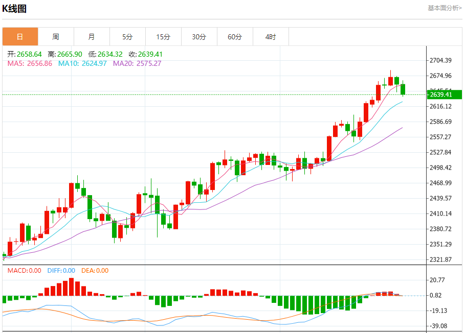本周黄金市场呈现波动格局。金价在初期触及历史高位,但在周五(10月4日)回落,现货黄金下跌至2651.56美元/盎司,黄金期货收于2667.80美元/盎司。美国9月就业数据意外强劲,新增25.4万个就业岗位,失业率降至4.1%,大幅超过市场预期。这一数据进一步降低了市场对美联储11月会议上大幅降息的预期,导致美元走强,抑制了