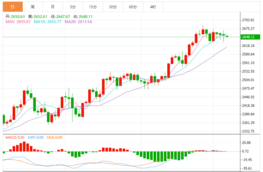 周四(10月3日),金价在盘中跌破了2645美元/盎司,日内跌幅接近14美元,报2644.66美元/盎司。 今日黄金价格技术分析: 从技术面来看,黄金的日线图依旧呈现出一定的建设性。14日相对强弱指数(RI)目前位于66.50附近,仍然处于看涨区域内。尽管金价在短期内承压,但RI未显示出明显的超买信号,这意味着黄金价格仍