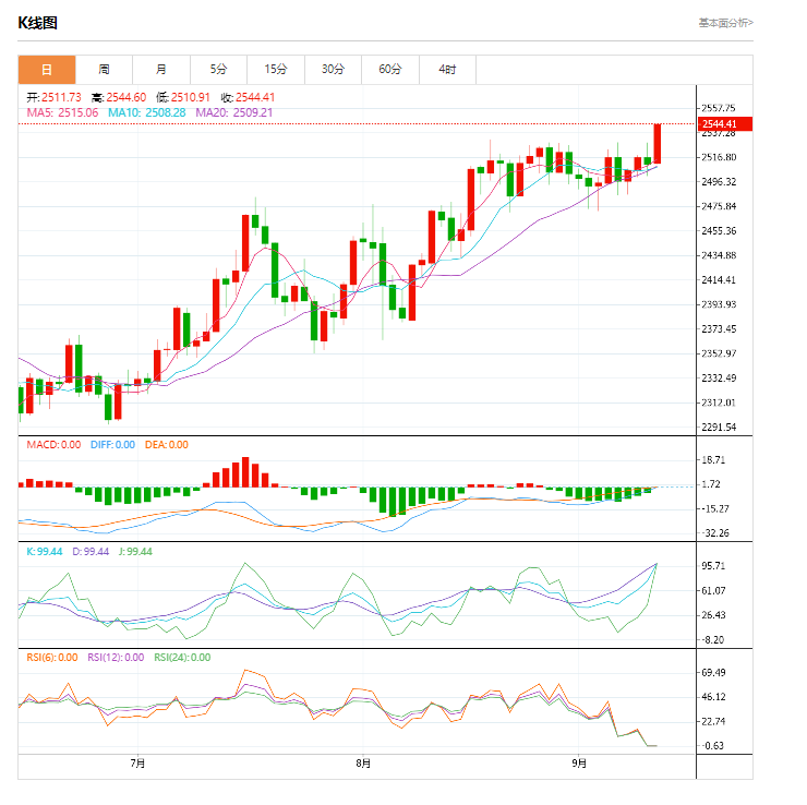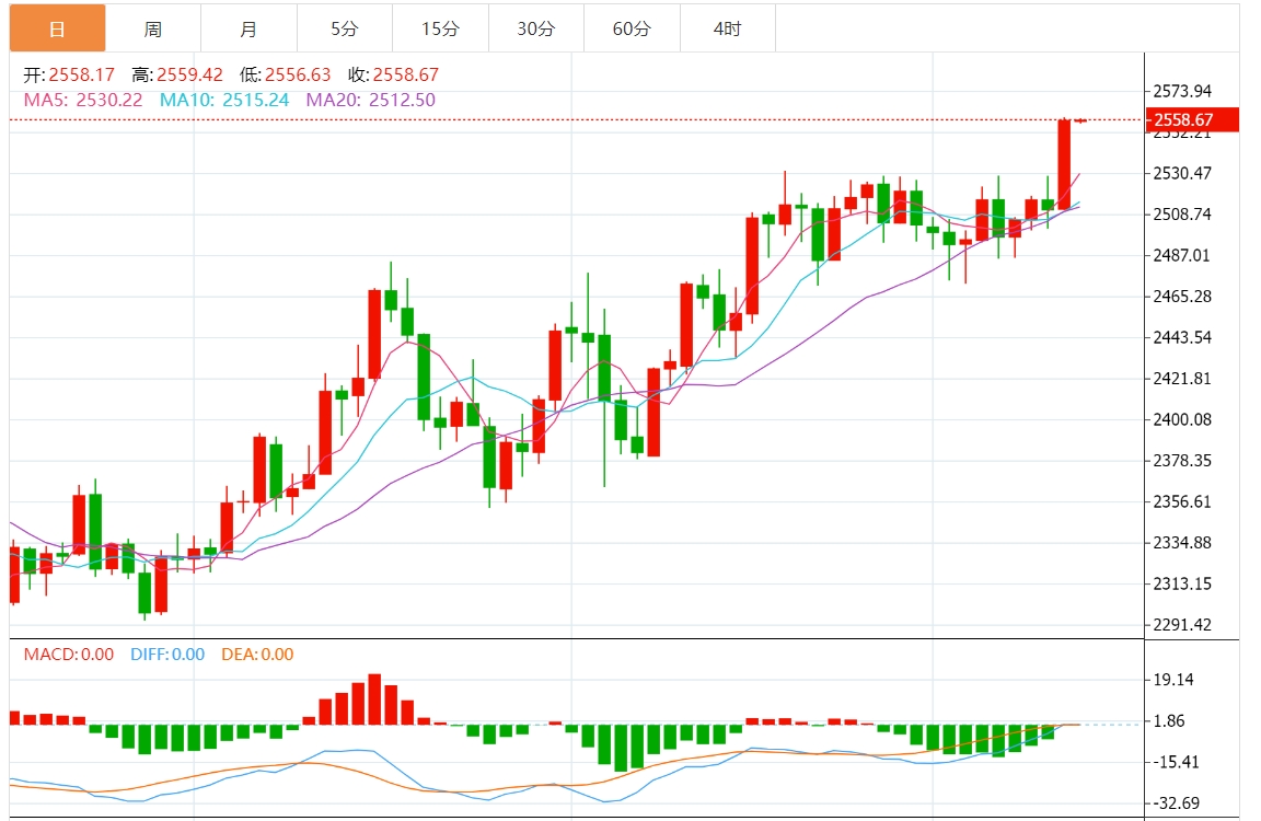 周五(9月13日)亚盘,现货黄金守在历史高点附近,现报2557.97美元/盎司附近。金价周四上涨超过1%,创下历史新高至2559.98美元/盎司,收报2558.54美元/盎司,受美联储下周降息预期推动,此前的数据显示美国经济放缓。另外,欧洲央行降息也降低持有黄金的机会成本,地缘局势担忧继续给金价提供避险买盘支撑。本交易日留意
