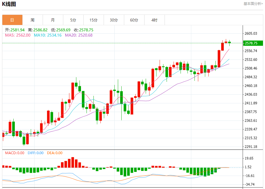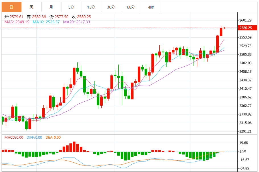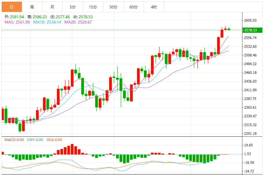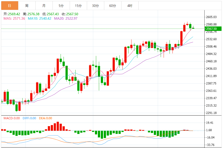 现货黄金价格飙升至另一个历史新高,大约在2589.52美元,下一个主要阻力来自2600美元的整数关口。 今日黄金价格技术分析: 黄金周五可以说震荡了一天,虽然晚间有一段小幅的上冲,但是并没有突破2585一线附近压制,最后尾盘收盘在2580下方,周五我也是多次提醒大家不要在2580上方追多,否则在高位追多会很难