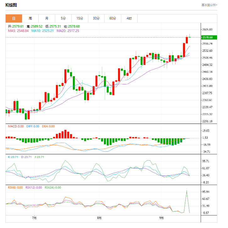 本周,黄金市场经历了显著的波动,随着美联储即将召开政策会议,投资者对未来货币政策走向充满期待。周五(9月13日),金价突破历史新高,现货黄金价格一度达到2586.09美元/盎司,收于2578.36美元/盎司。金价的迅猛上涨主要得益于市场对美联储降息的预期,避险需求以及央行的大规模购买操作推动了黄金的上涨。本周黄金涨