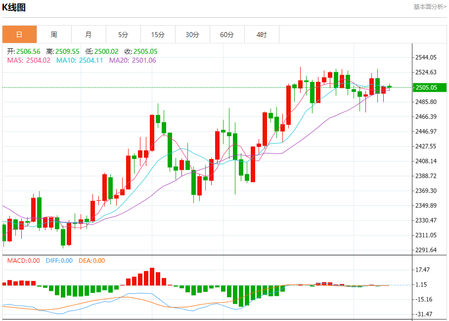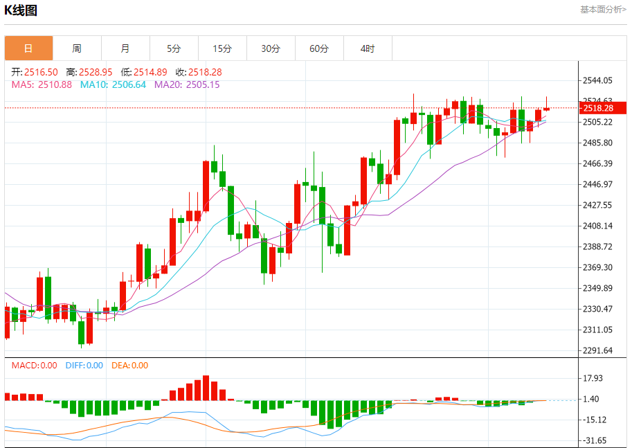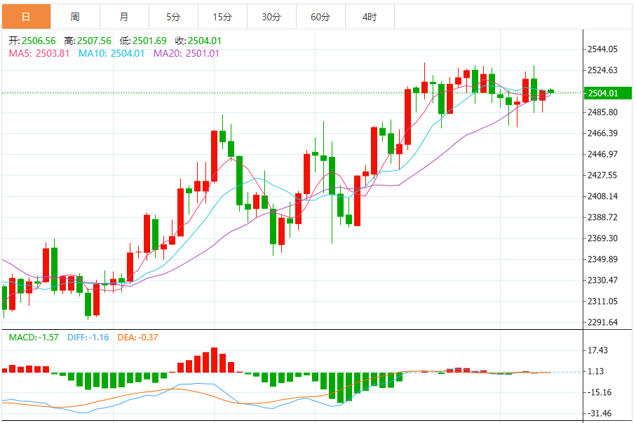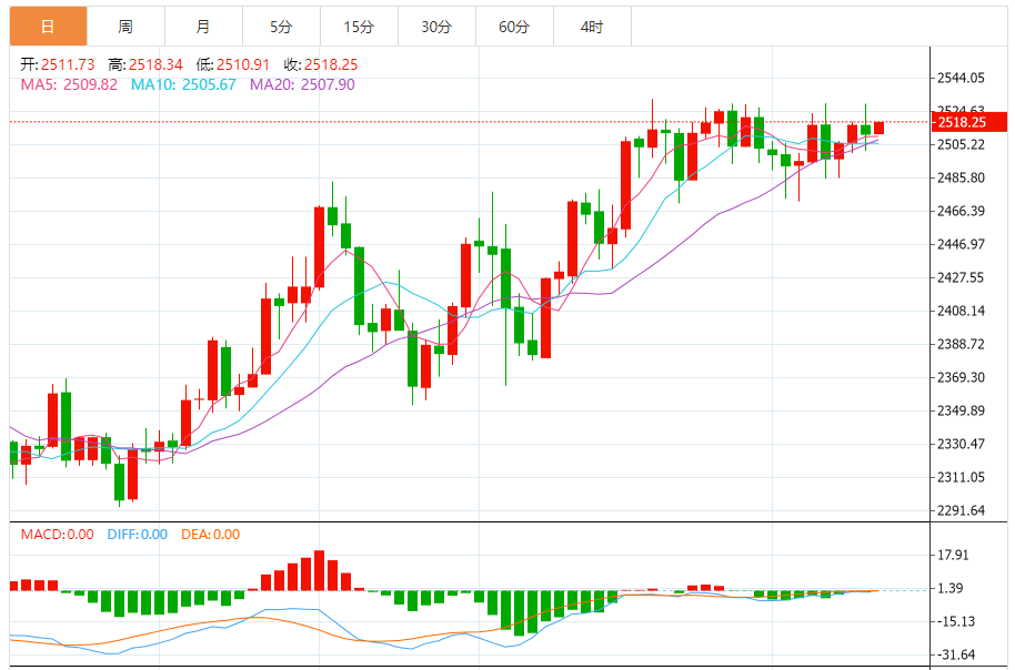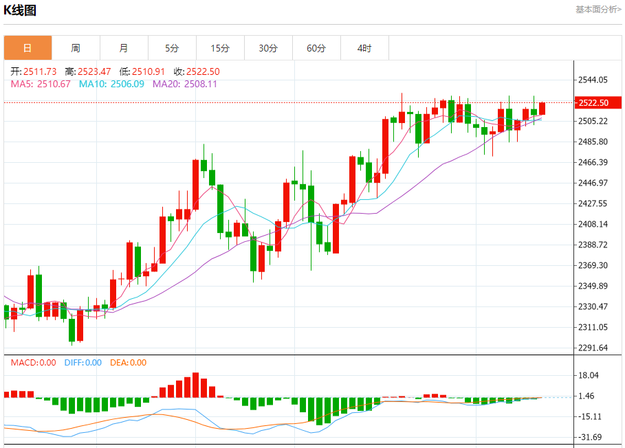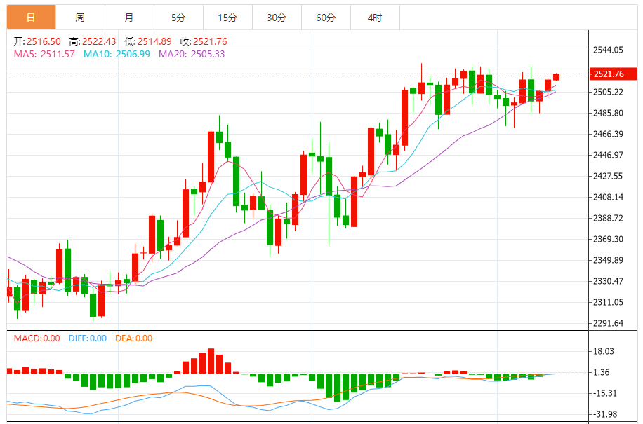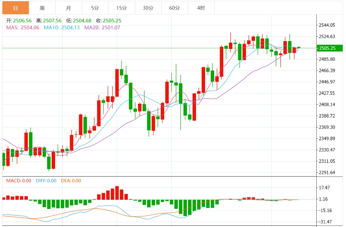 现货黄金刚刚突破2500.00美元/盎司关口,最新报2500.07美元/盎司,日内涨0.12%; 今日黄金价格技术分析: 黄金价格昨日呈现明显的升势,目前金价已经触及2520.00美元/盎司区域。黄金需要获得正面动能,以帮助推动金价在未来几个交易时段进一步上涨。目前等待金价测试首个看涨目标2540.00美元/盎司,假如突破