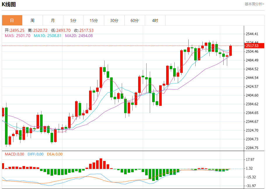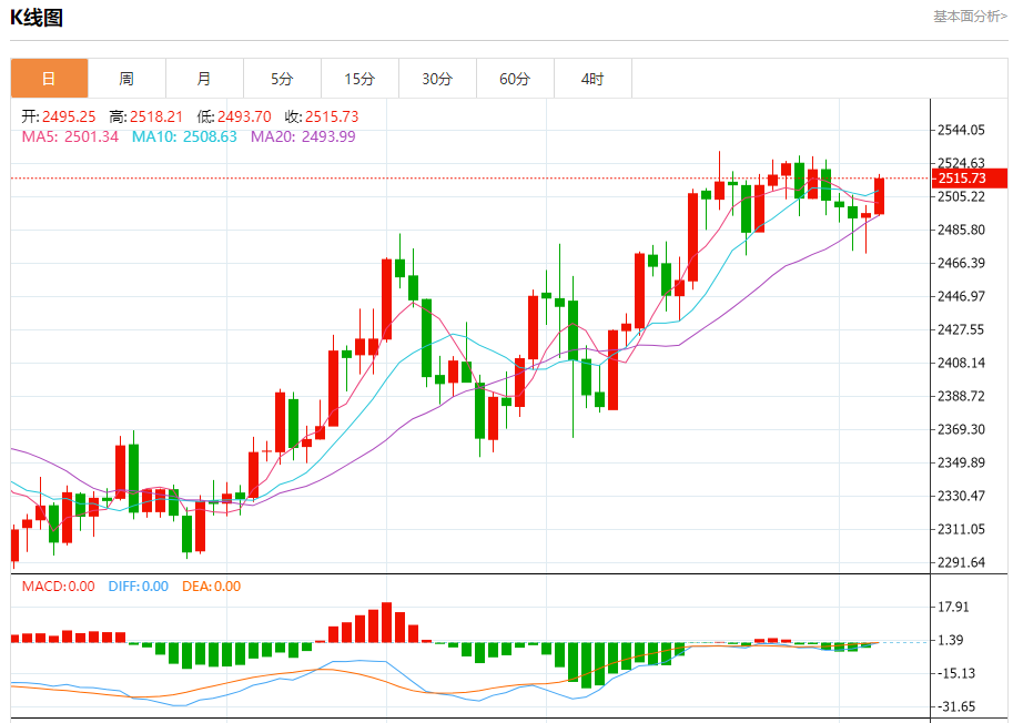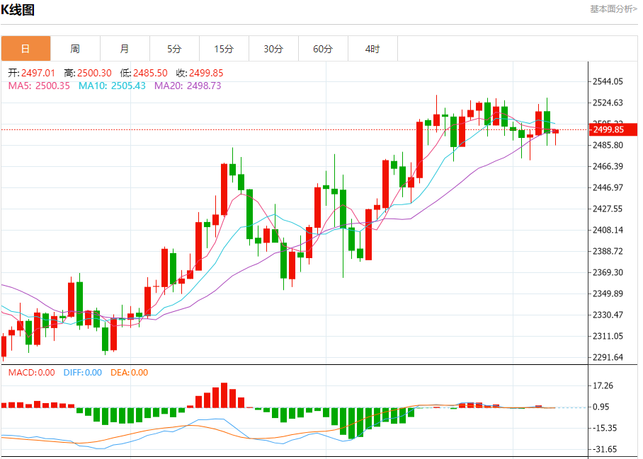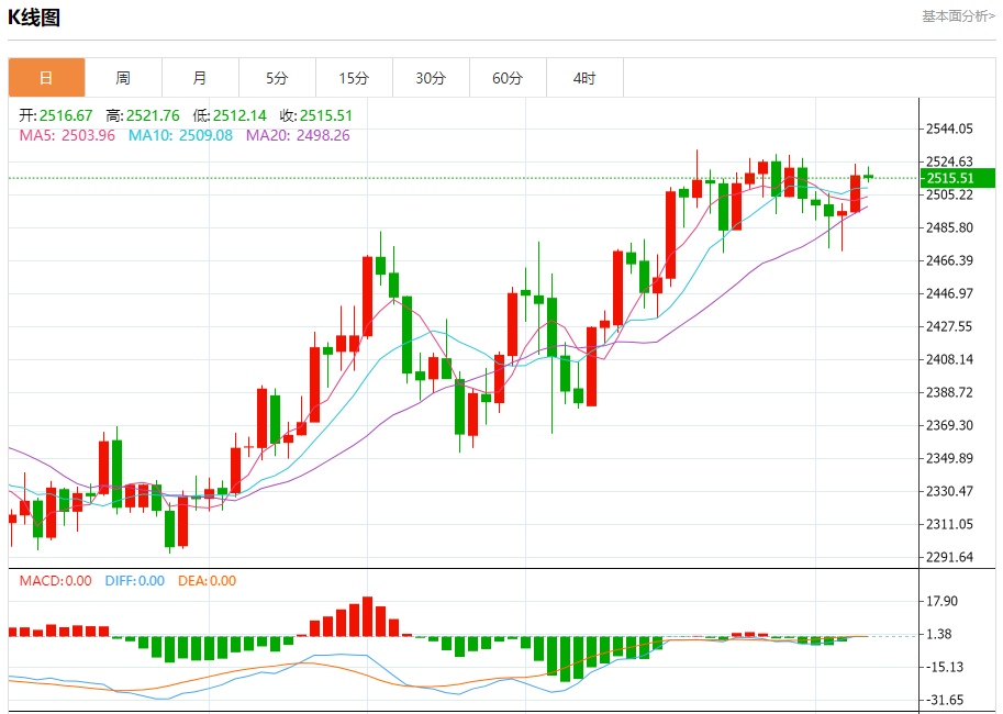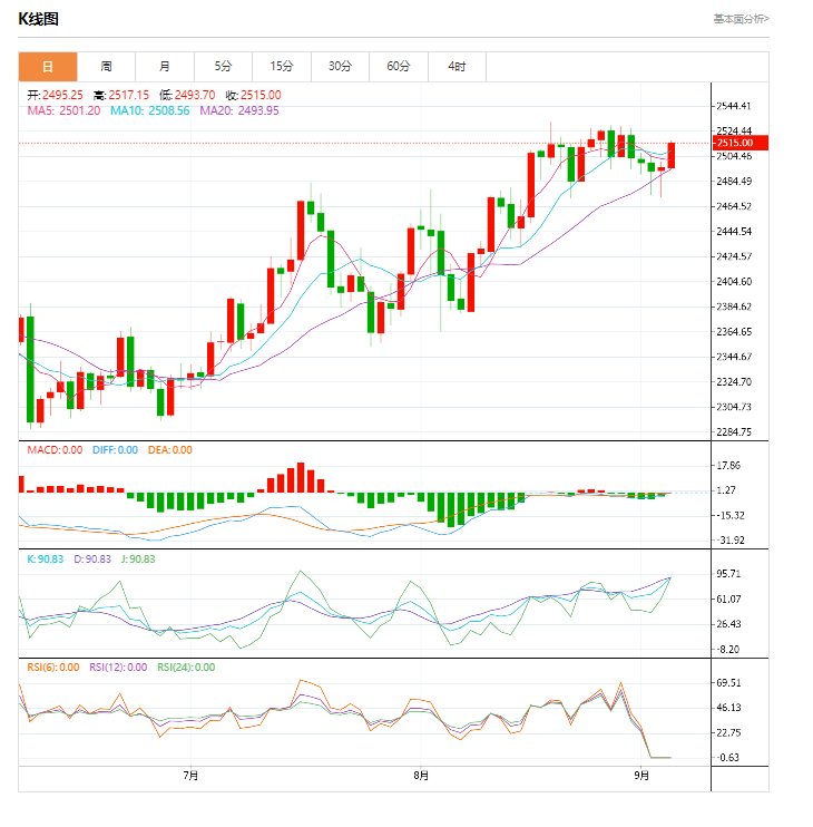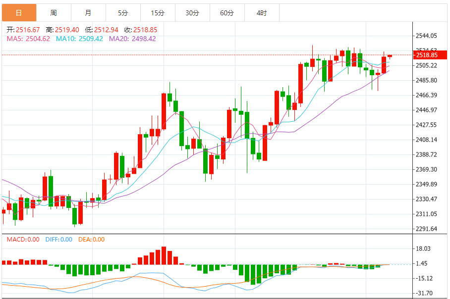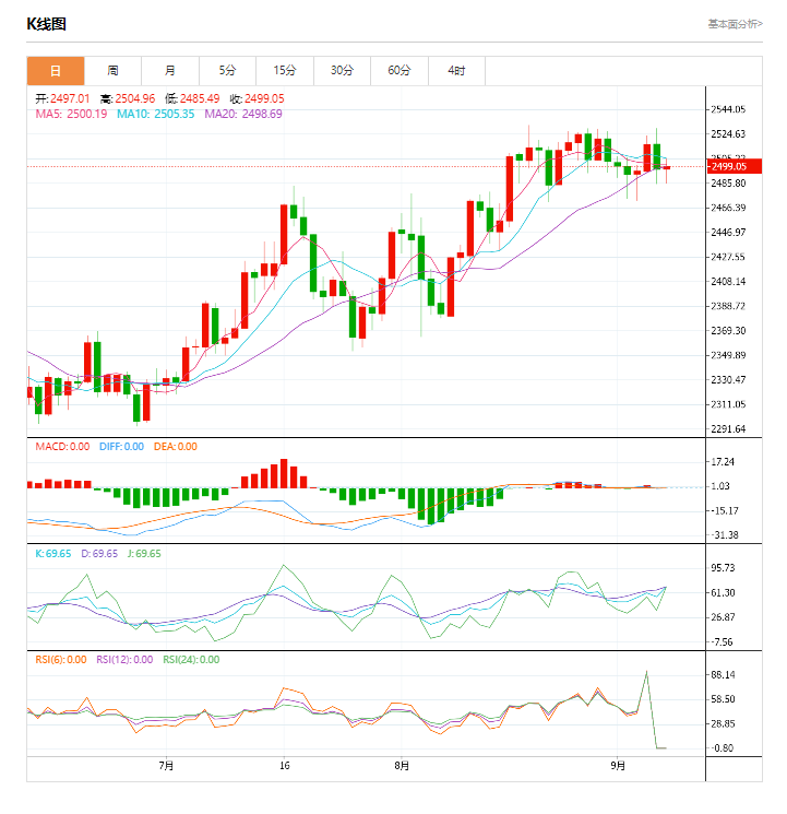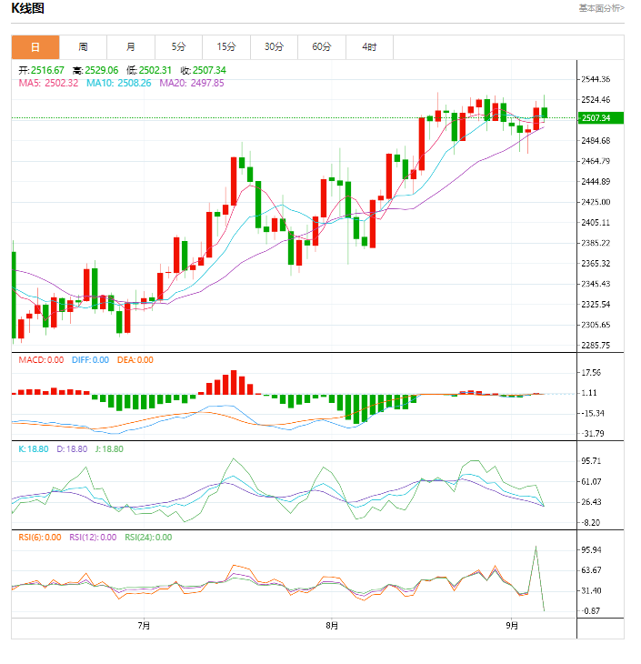 周四(9月5日)本交易日现货黄金日内维持震荡走势,今日开盘报2494.95美元/盎司,最高触及2516.83美元/盎司,最低触及2493.59美元/盎司,截止发稿金价报2516.26美元/盎司,涨幅0.84%。 今日黄金价格技术分析: 黄金周三走出了深V反弹行情,早盘时段一直承压在2496美元位置,并一直未能有效冲破2498美元的日高压