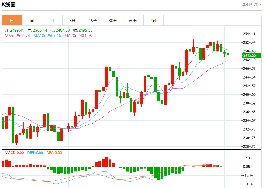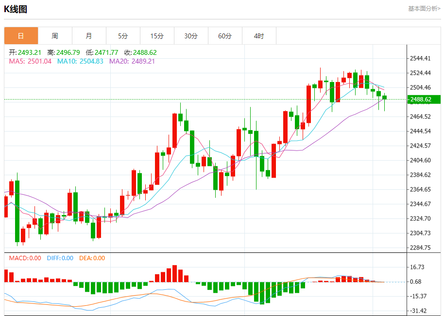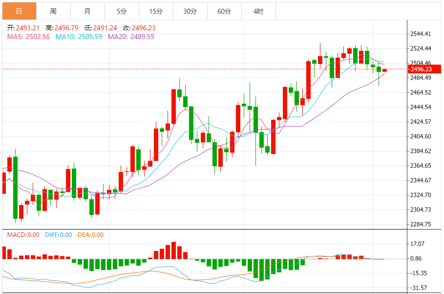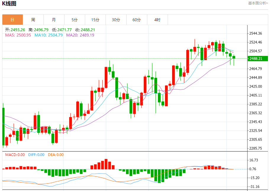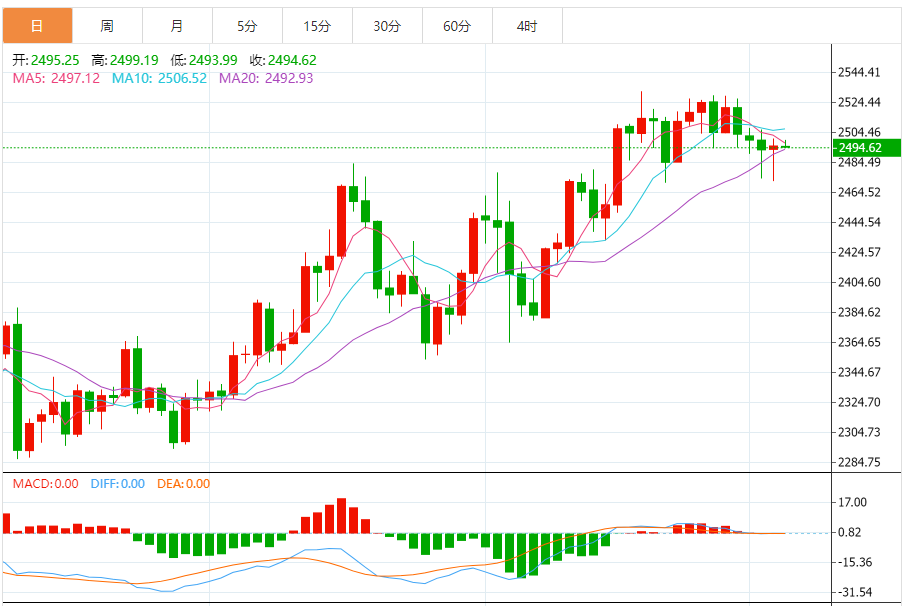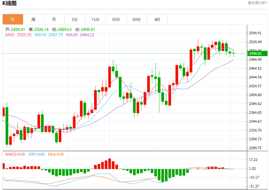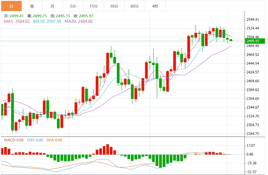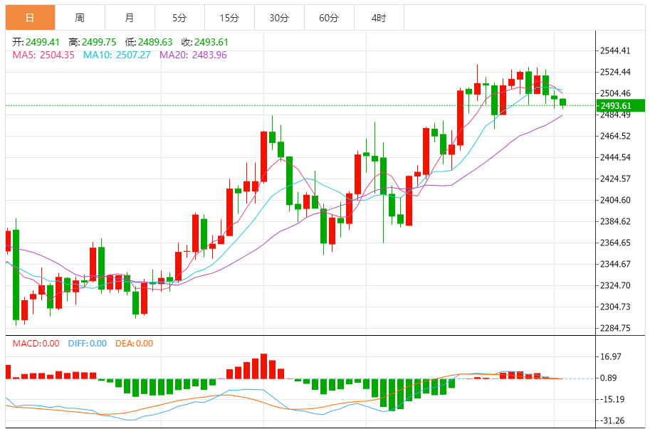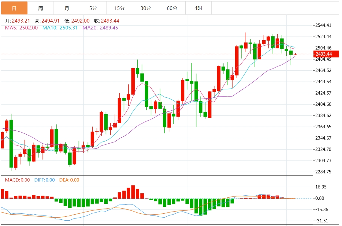 现货黄金刚刚突破2490.00美元/盎司关口,最新报2489.99美元/盎司,日内跌0.37%; 今日黄金价格技术分析: 黄金日线小阴星K线整理修整。日线进入高位钝化阶段,上涨无力破高,伴随横向整理蓄势过程,美元一波低位反弹,限制了金价短期进一步冲高动能,日线目前围绕2530高点之下走震荡回落,昨日在小周期中轨处