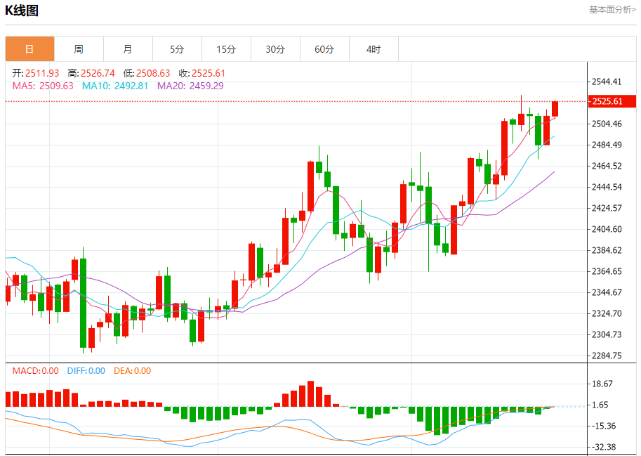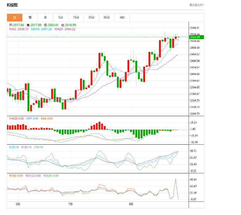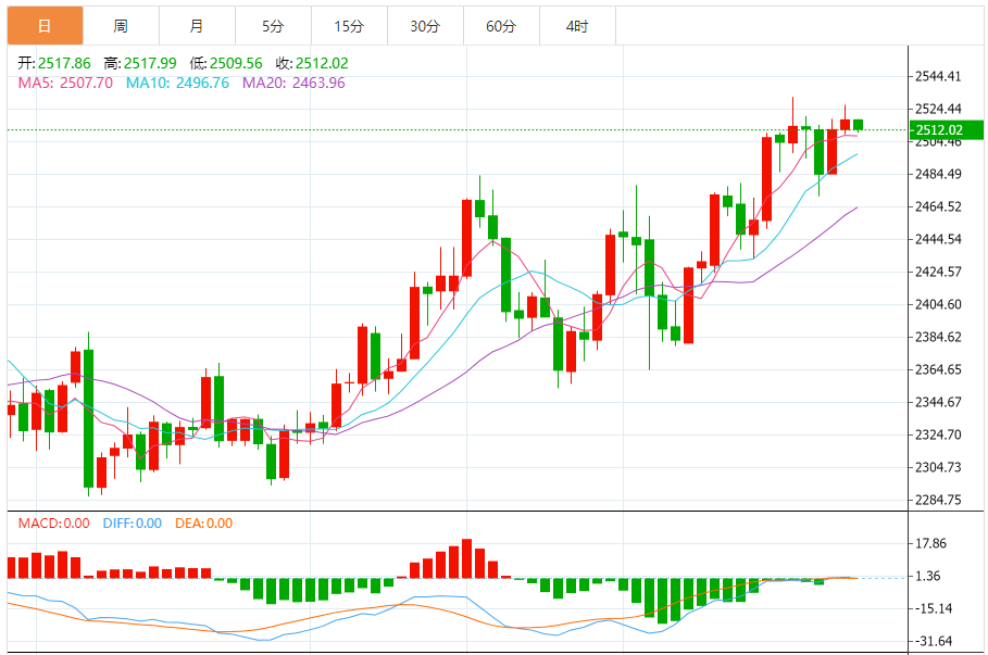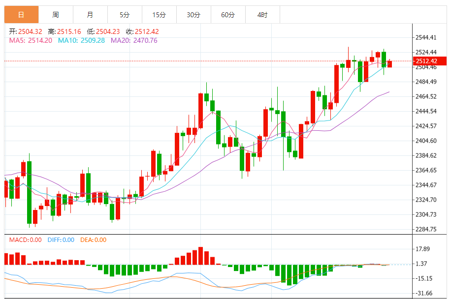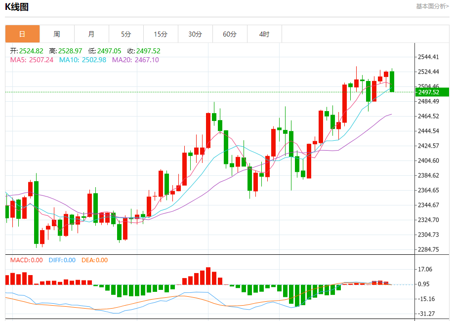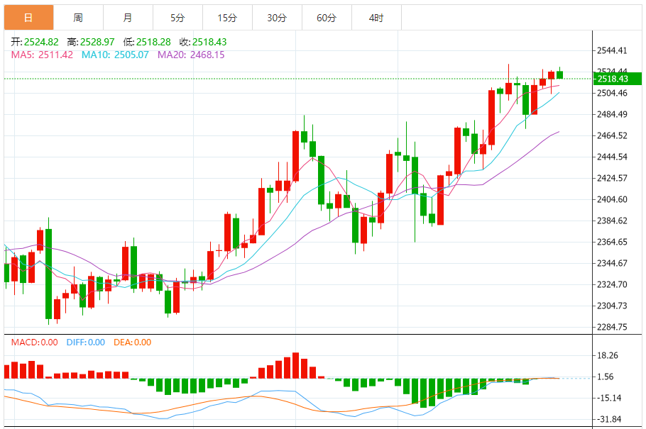 近期,黄金市场价格突破了每盎司2500美元的心理关口,再次超出了市场的预期。 今日黄金价格技术分析: 昨日黄金日线再次收一根阳线,底部三连阳,日线暂时企稳,整体结构保持向上运行,后市继续走强的概率大,另外ACD指标高位金叉,指标显示偏向多头趋势,同时日线也是运行一个低点抬升,高点创新高的多头走势,那