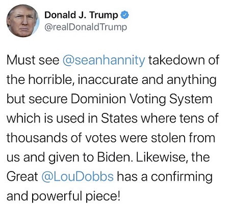 当地时间11月13日,特朗普发推称:“取缔可怕的、不准确的、完全不安全的Dominion投票系统,在一些州,这一系统从我们那里窃取数万张选票,并将这些选票投给拜登。”随后,特朗普又转发了Sean Hannity节目的视频并配文称,“这些有争议的州应该立即被列入特朗普获胜的范围里。拜登没有赢,他输了很多!”