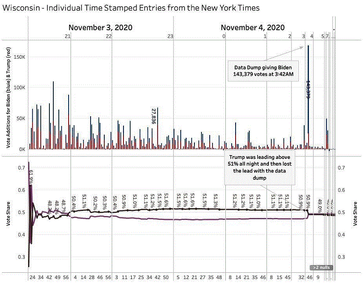【特朗普刚刚发推!威斯康星州这个时间点突然有超过14万票投给拜登“令人难以置信!”】当地时间11月18日晚间,美国总统特朗普最新发推称,民主党总统候选人拜登在投票日隔日的一个时间点,一次收到超过14万张选票,特朗普直呼“令人难以置信”。特朗普在推特发出一张图表,为《纽约时报》威斯康星州个别时间点得票状况