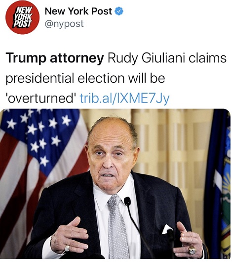 据《纽约邮报》周一(11月16日)最新报道,当地时间11月15日,美国总统特朗普的私人律师、纽约市前市长朱利安尼(RudyGiuliani)坚称此次大选结果将被“推翻”,声称他有“证据”表明“腐败机器”删除了数百万张特朗普的选票,但朱利安尼同时也表示,目前还不能公开这些证据。 朱利安尼11月15日接受美国福克斯新闻“周日早