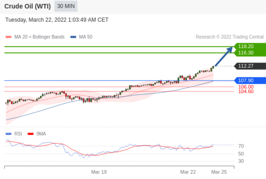 美国原油 (WTI) 期货 (K2) 当日内交易策略: 在 107.90 之上 目标价位为 116.30 (20220322)