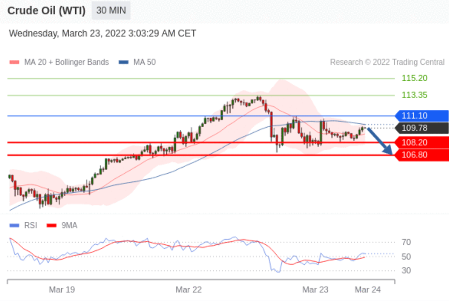 交易策略: 在 111.10 之下,看跌,目标价位为 108.20 ,然后为 106.80 。