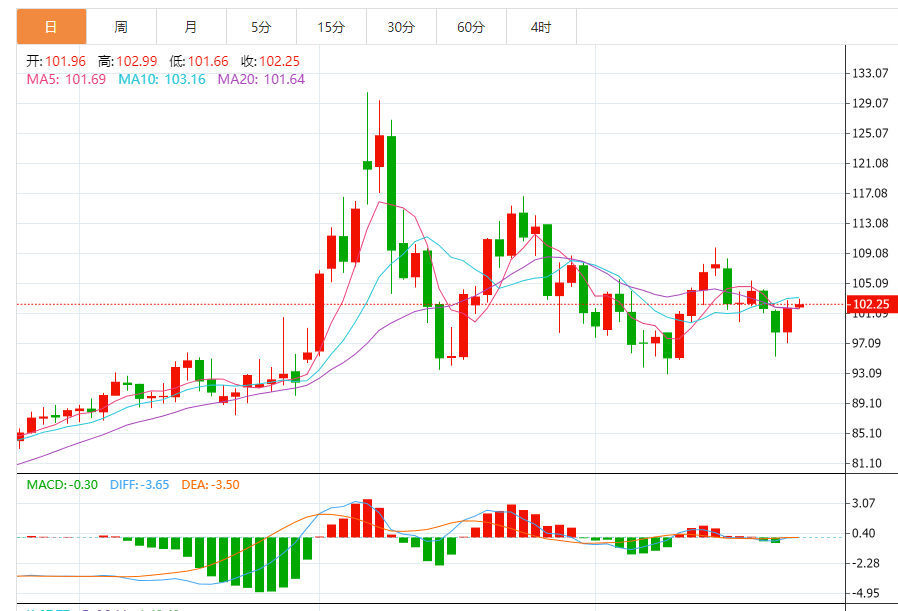 今日预期交易区间在 98.50 支撑位和 104.60 阻力位之间。