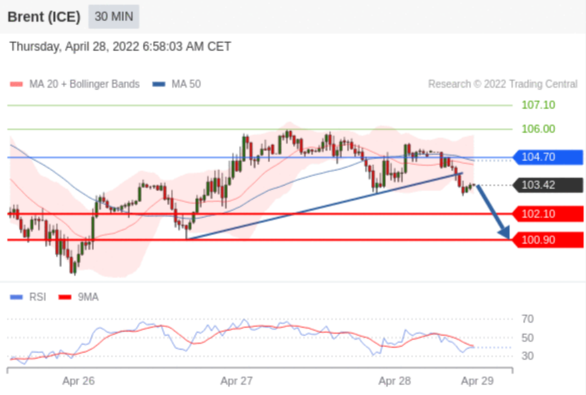 交易策略: 在 104.70 之下,看跌,目标价位为 102.10 ,然后为 100.90 。