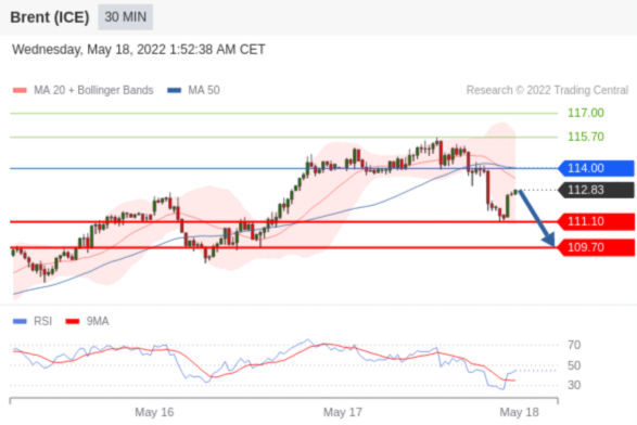 布伦特原油 (ICE) (N2) 当日内交易策略: 在 114.00 之下 目标价位为 111.10 (20220518)