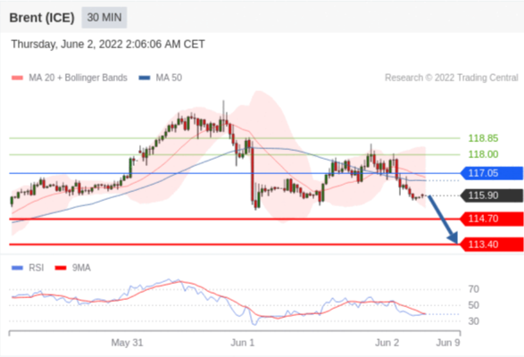 布伦特原油 (ICE) (Q2) 当日内交易策略: 在 117.05 之下 目标价位为 114.70(20220602)